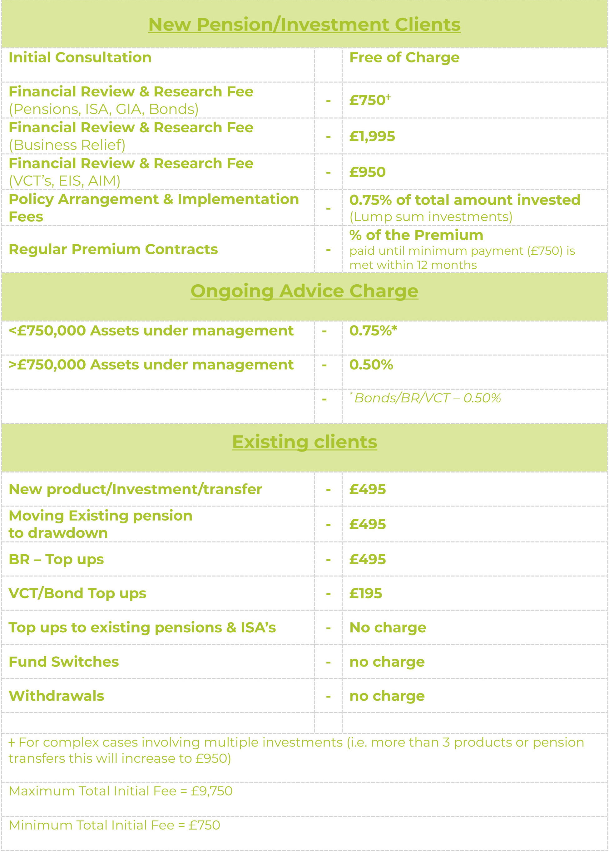 As financial advisors we provide individuals and businesses with practical and relevant solutions to help them to meet their financial objectives. Some of the key areas we advise on are listed below. Simply click on the relevant box to watch a video explaining the Service (this will open a new tab). Of course, we'll be happy to discuss your own personal situation and goals with you if you have any further questions.